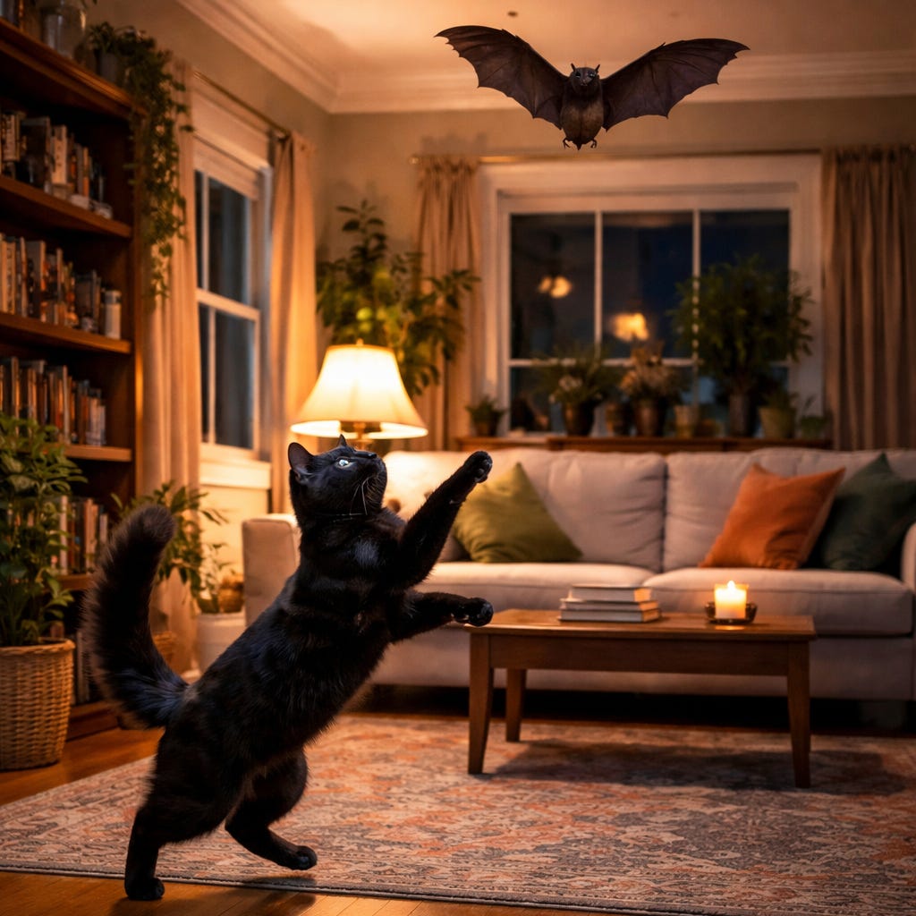 Después de algún tiempo de sostenida aunque tensa calma, esta mañana ocurrió algo inesperado. La convivencia entre los gnomos Juan y Sofía, la gata Nyan, mi esposa Claudia y yo se había mantenido todo este tiempo en un nivel de tranquilidad aceptable. Los gnomos siempre ayudando en la cocina, la gata siempre tratando de comérselos y Claudia y yo siempre intercediendo para que las cosas no pasen a mayores. El mes pasado nos mudamos a un nuevo departamento. La mudanza transcurrió sin incidentes, con la gata encerrada en una valija para que no se asuste y los gnomos escondidos también en una caja, pero para que no se asusten los de la mudadora. Todavía estamos desarmando los últimos paquetes y acomodando lo que no nos atrevimos a tirar en su momento. El nuevo departamento es en un piso alto, con vista abierta y todos los ambientes al exterior, incluido el lavadero. Alertados oportunamente por el encargado y algunos vecinos, ayer colocamos una red de protección en las ventanas para que no entren murciélagos. En todas las ventanas, menos en la del lavadero, porque ¿a quién se le puede ocurrir que un murciélago entre por el lavadero?